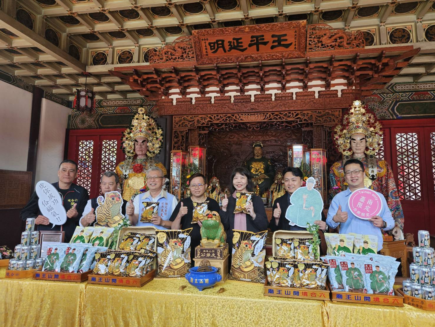 此次「成功虎爺餅」由文化局攜手聯華食品工業股份有限公司合作開發,包裝設計轉化虎爺公「喬治」活潑討喜的形象,搭配金色光芒背景,傳遞招財進寶、事事成功的祝福,讓民眾在品嚐美味的同時,也能把新春好運一併帶回家。文化局期盼透過古蹟限定商品,成為民眾認識臺南宗教信仰、傳統工藝與文化精神的生活媒介。